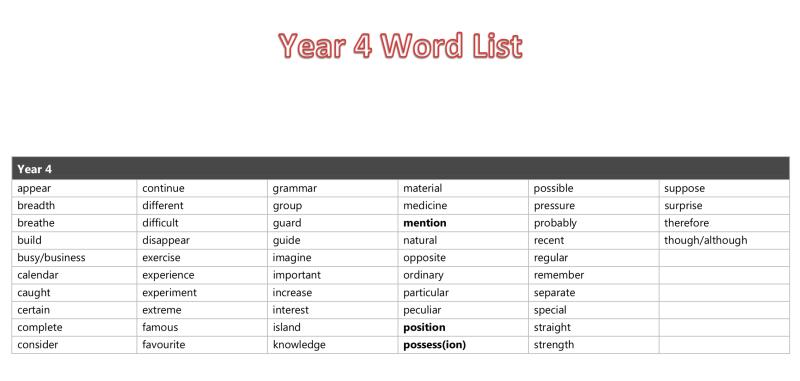 Our aim in Year 4 is to support the children in their spelling journey. Many of the spellings they will learn follow patterns and rules. Every week children will be taught the patterns and rules to apply the spellings correctly e.g. apostrophe for possession, prefixes, suffixes etc. They will receive regular spelling homework linked to what they are learning in school. Below are a few files for you to familiarise yourself with. If you have any questions, please don’t hesitate to ask us.