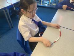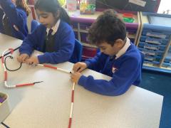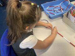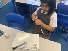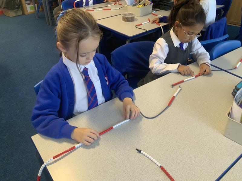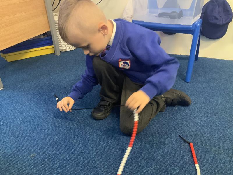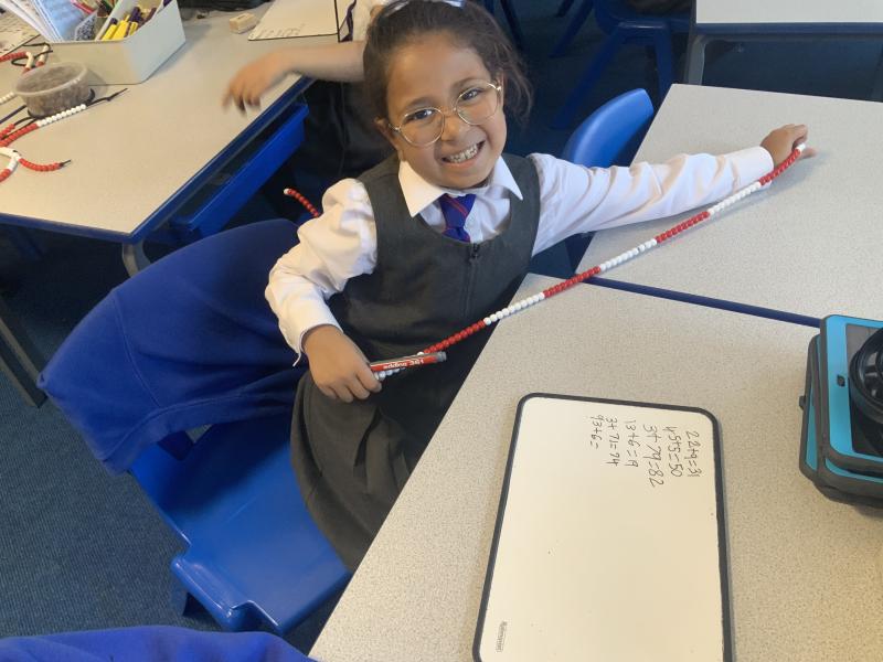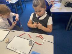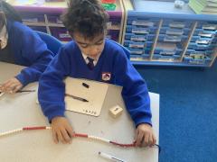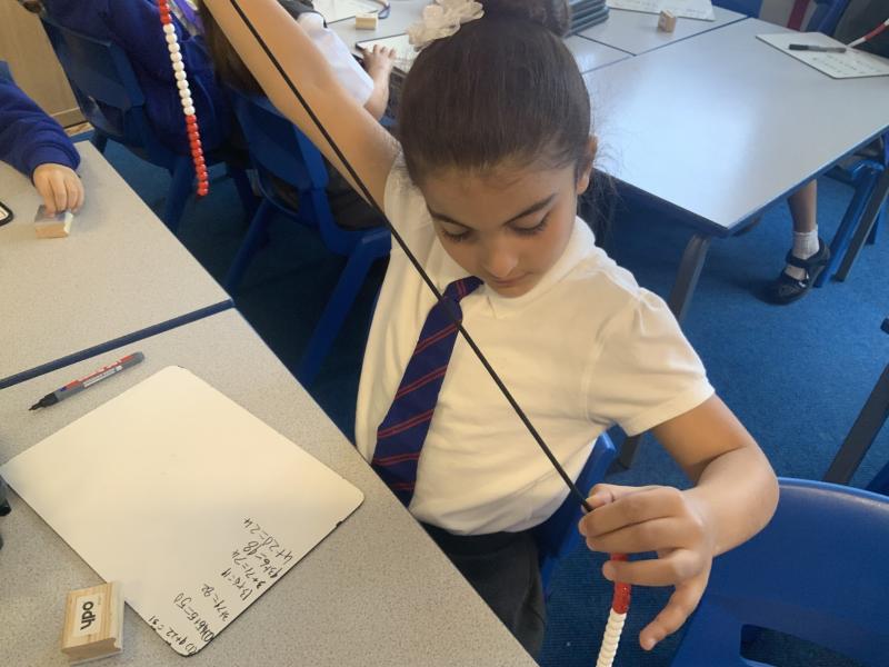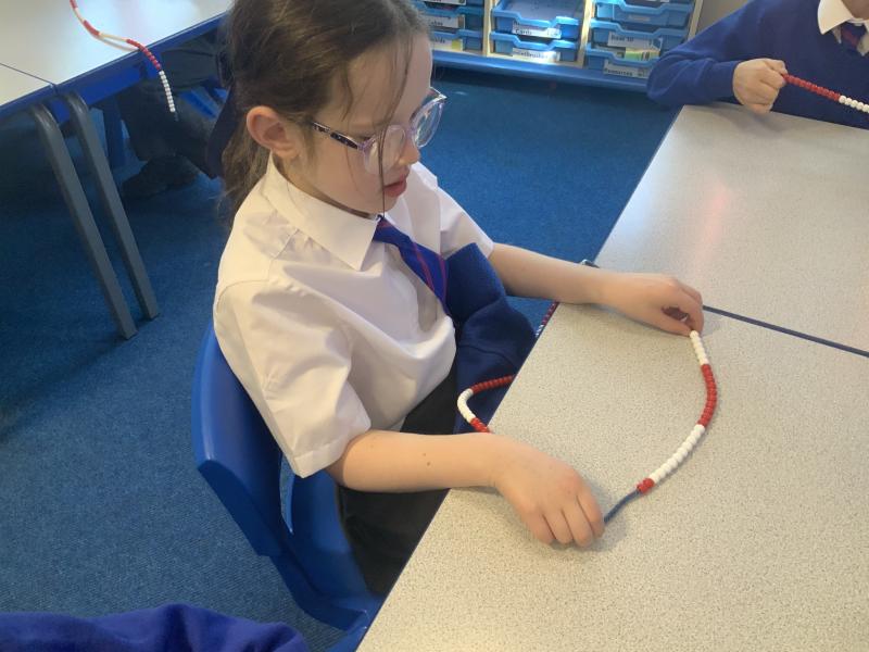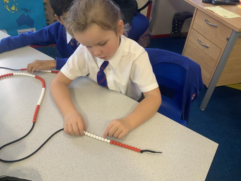 We tried using a bead string to add a two-digit and one-digit number. We recognised the bead string is ordered in groups of 10 and used this knowledge to help us make the 2-digit numbers.