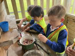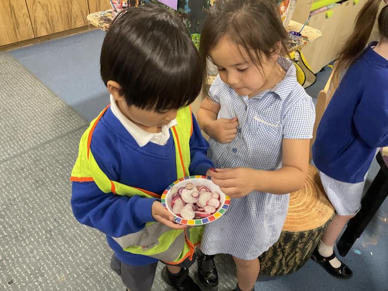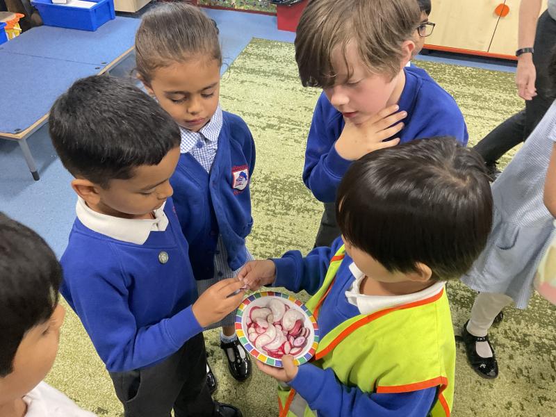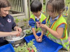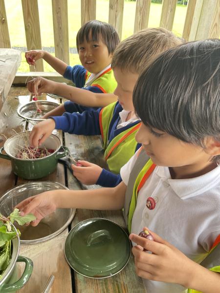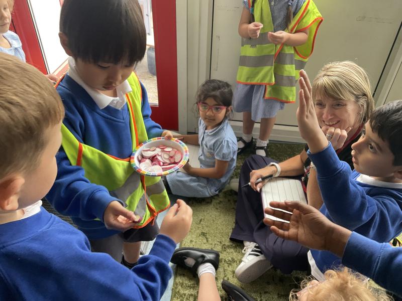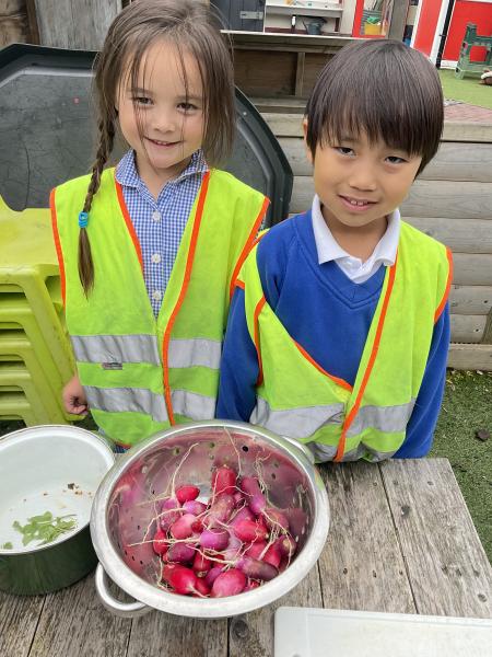 Some of the Early Years children wanted to check on the raised beds this afternoon and they were very surprised to discover a huge crop of radishes! They picked them, washed them and then helped to chop them before finally offering them out to all of their friends to eat. We researched whether Basil the tortoise was allowed to eat radishes and learnt that he could have the leaves. We popped some in his bowl for him to enjoy! The remaining leaves and the roots made a fun addition to our mud kitchen. We love child led learning!