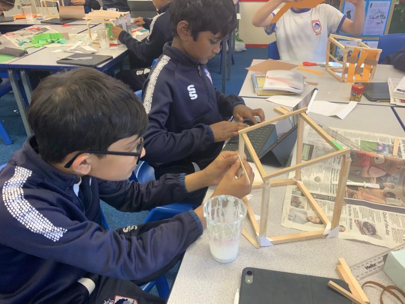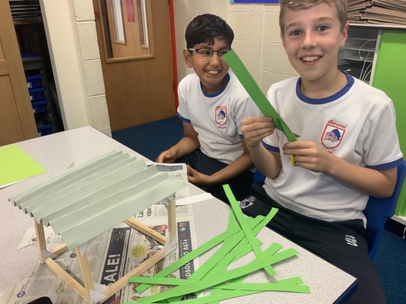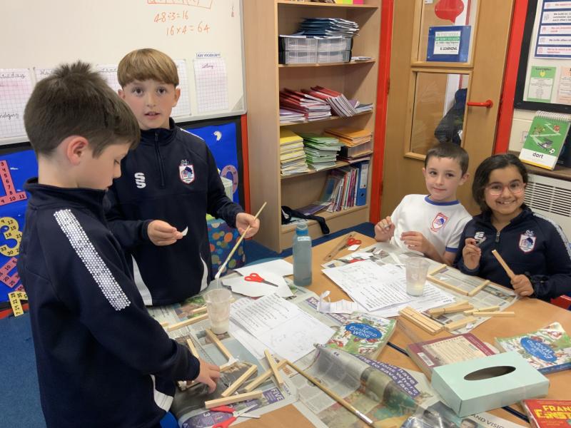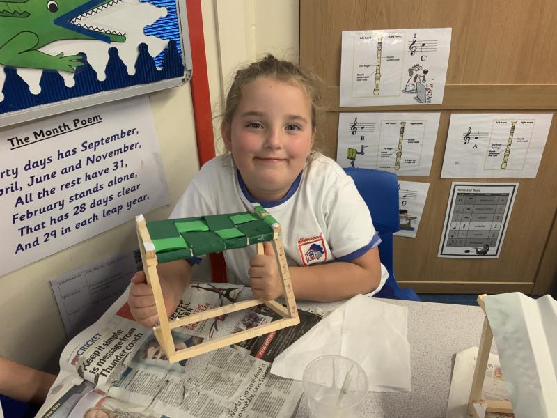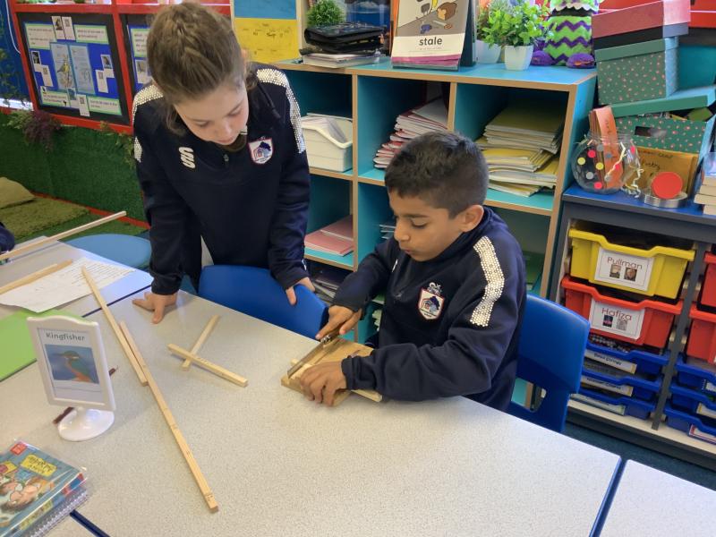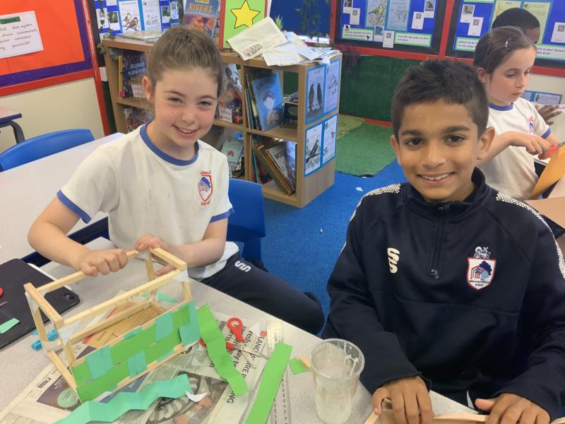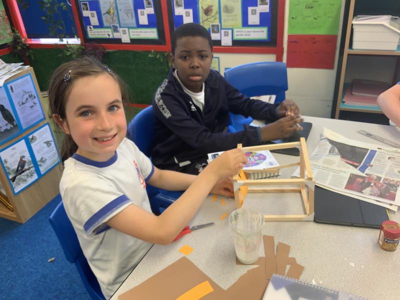 Year 4 have been designing and making bird hides in DT, inspired by their class novel Twitch. They explored different bird hide designs and considered how to make theirs a stable structure. They then worked out how many pieces of wood they would need and their dimensions. Using a razor saw, they cut their lengths of wood then built their bird hides, strengthening the corners with cardboard triangles. Finally, they attached their roofs and added cladding by weaving card, leaving windows to watch birds through.