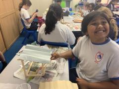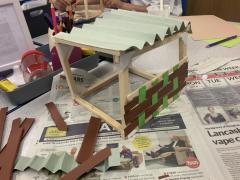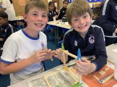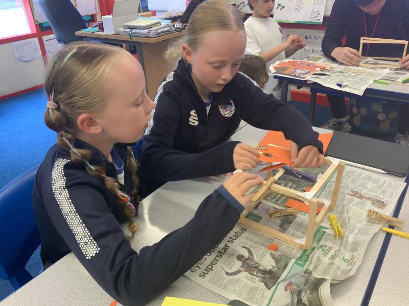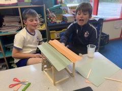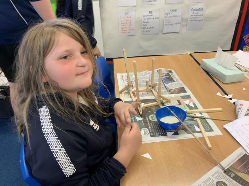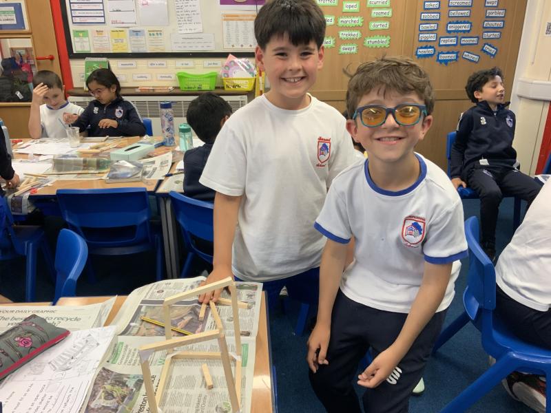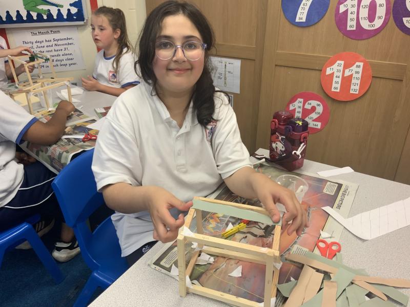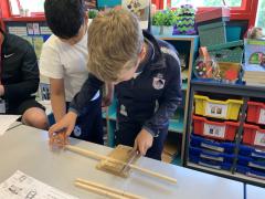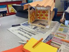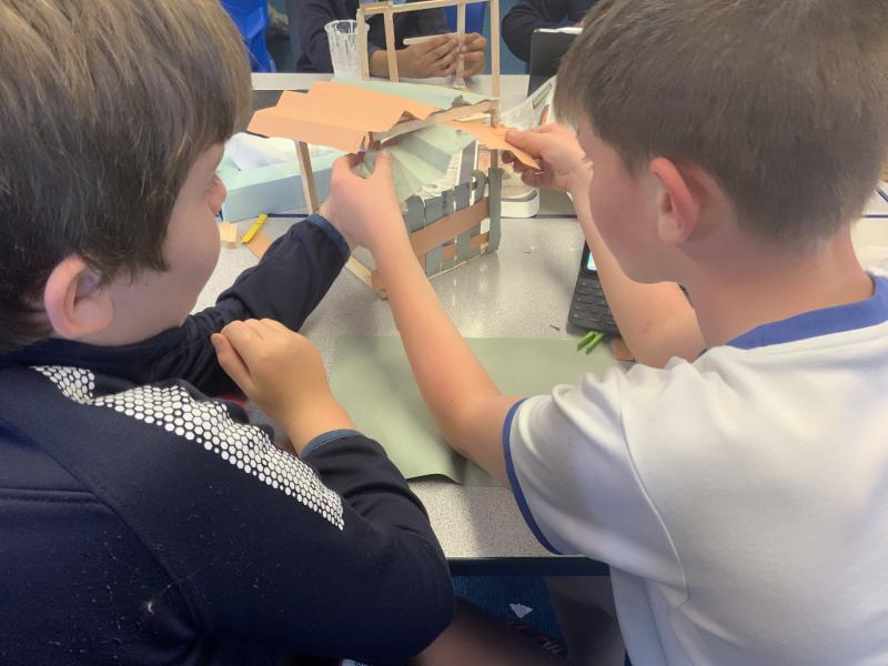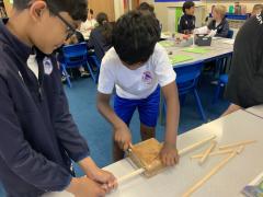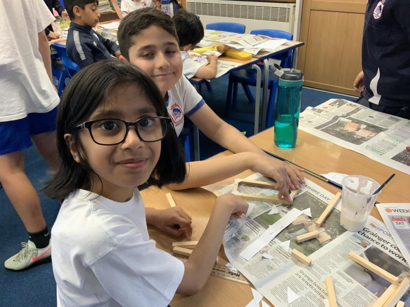 Year 4 have been designing and making bird hides in DT, inspired by their class novel Twitch. They explored different bird hide designs and considered how to make theirs a stable structure. They then worked out how many pieces of wood they would need and their dimensions. Using a razor saw, they cut their lengths of wood then built their bird hides, strengthening the corners with cardboard triangles. Finally, they attached their roofs and added cladding by weaving card, leaving windows to watch birds through.