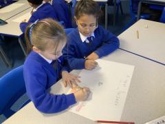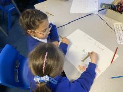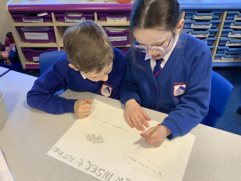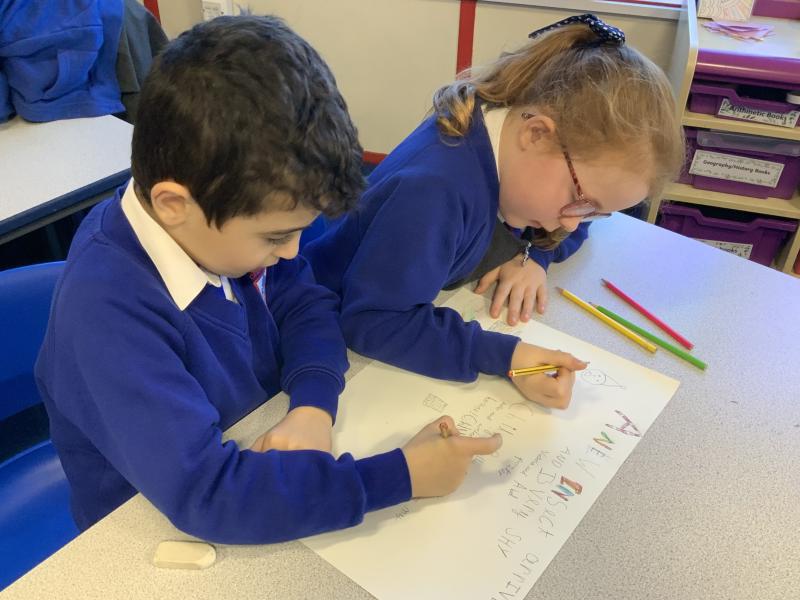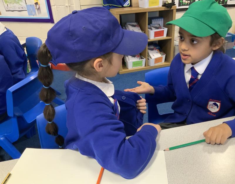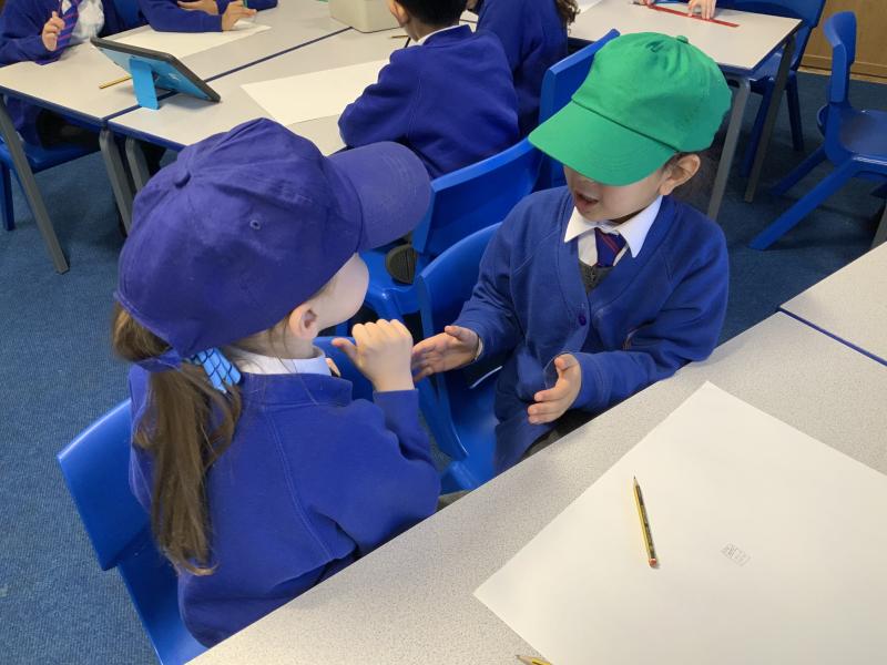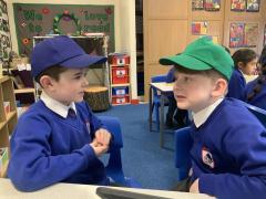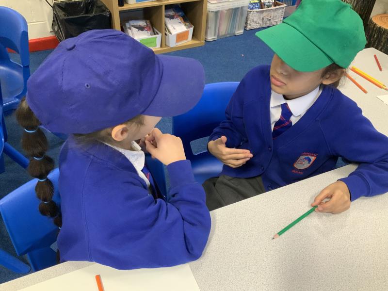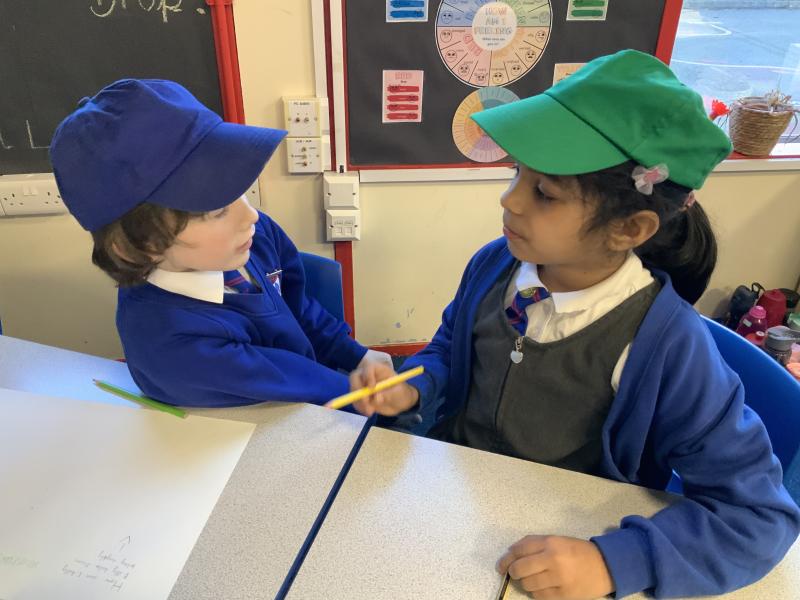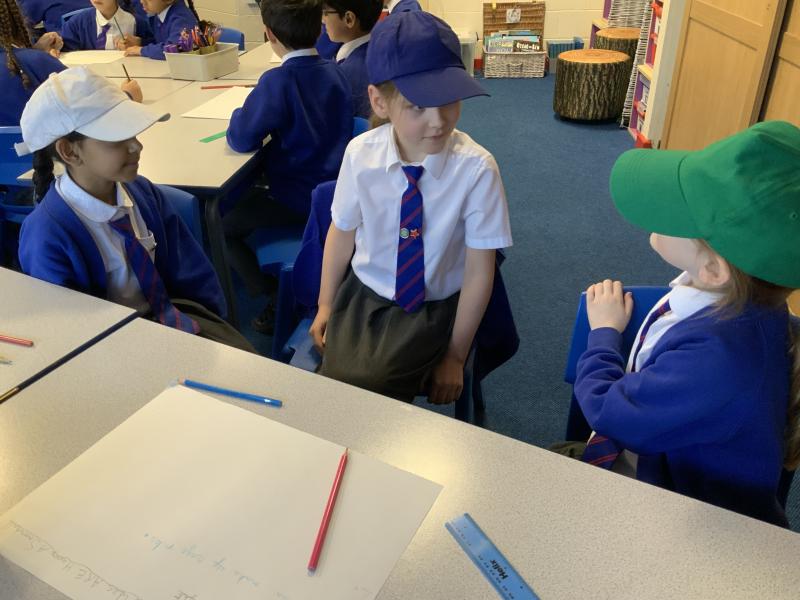 We worked together in roles to think of solutions to Chilly Billy's problems. We worked in pairs or trios with one person giving the facts (white hat), one person being the idea planner (blue hat) and one person giving the new ideas (green hat).