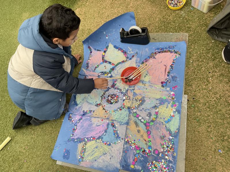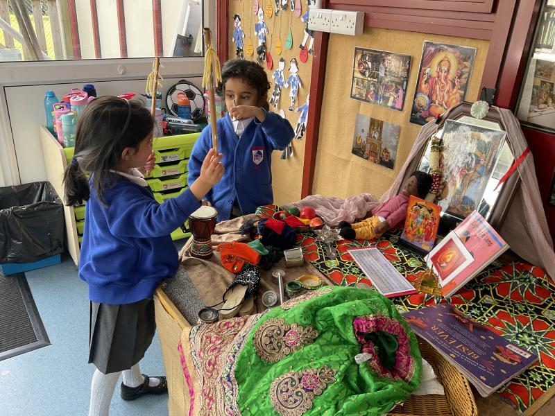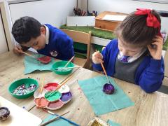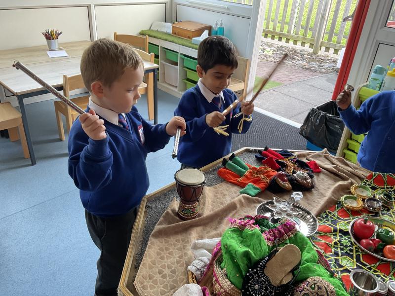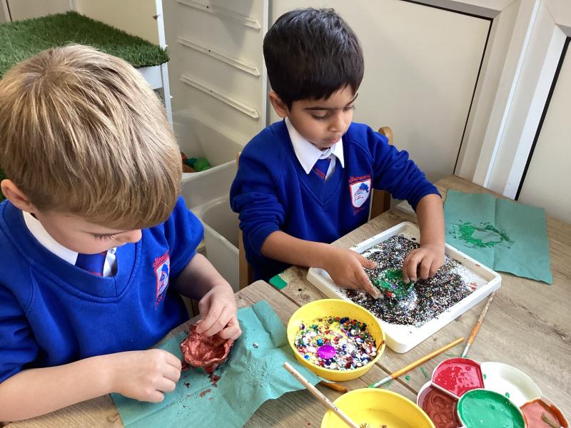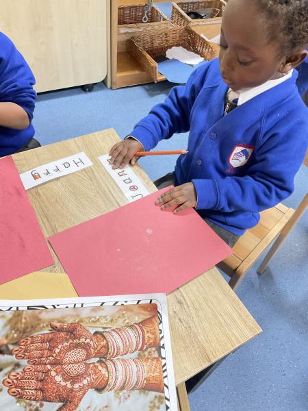 The children have been busy learning about the festival of Diwali over the last couple of weeks. Our home corner has been enhanced with a shrine and some decorations and we have had lots of resources out for children to handle and explore. The children have enjoyed making Diya lamps and Diwali cards and were fascinated to watch and learn how people make Rangoli patterns. It inspired us to make some rangoli patterns of our own. We have also enjoyed looking at lots of beautiful Mendhi patterns and had a go at designing our own.