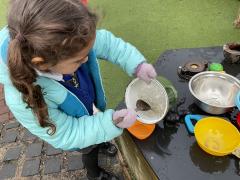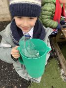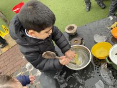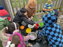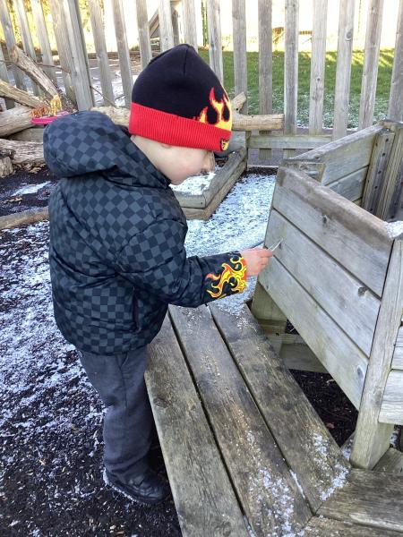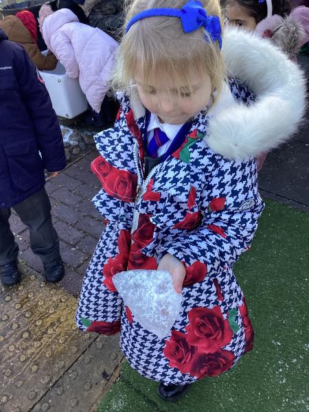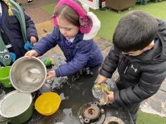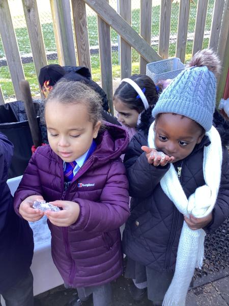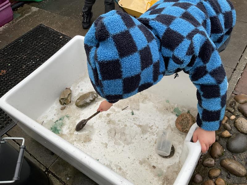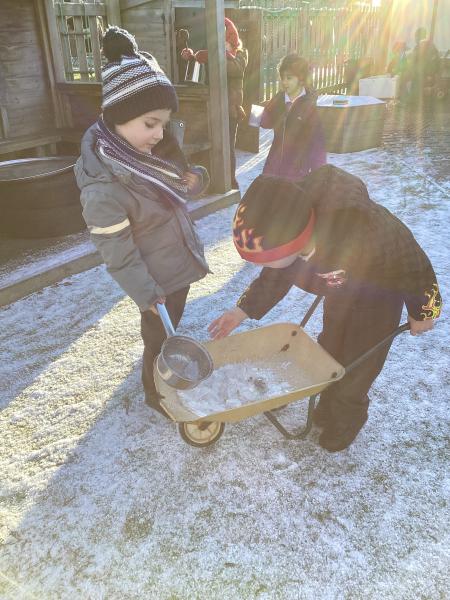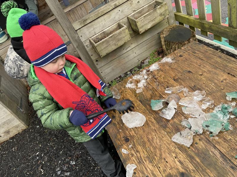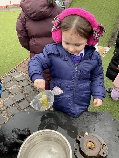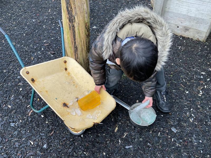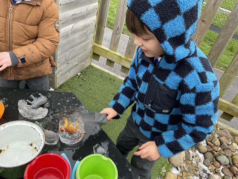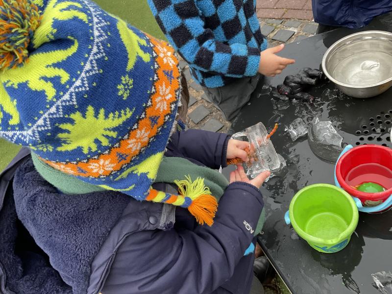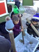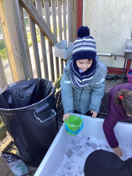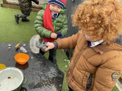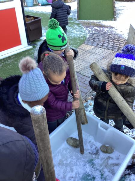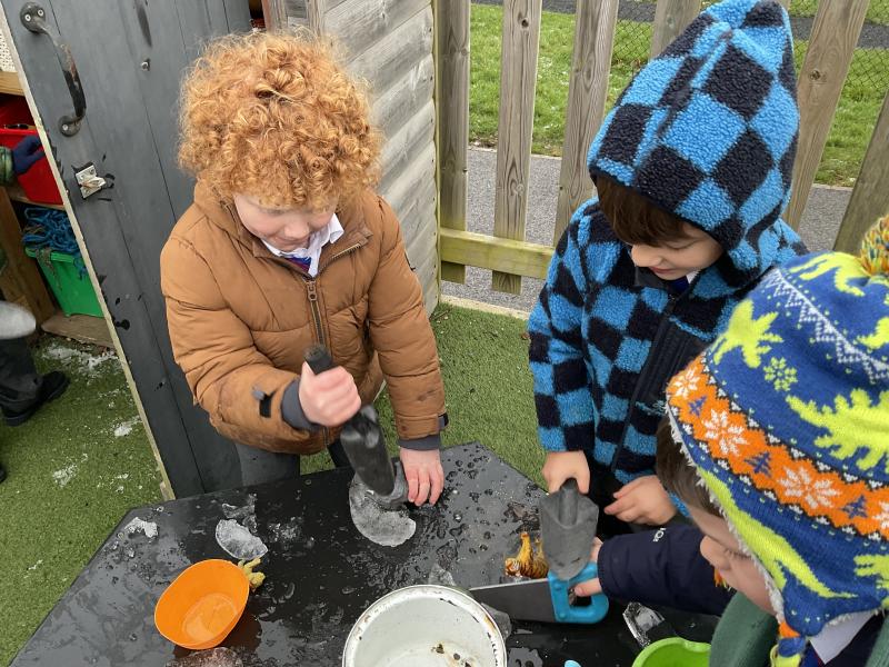 The cold weather brought with it lots of opportunities for learning and fun this week! The children really enjoyed trying to rescue toys that had frozen in the water - they came up with lots of great ideas and worked really well as a team.They then had lots of fun breaking up the ice, transporting it and using it in the mud kitchen!