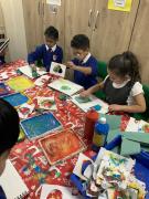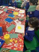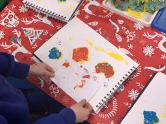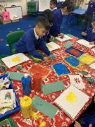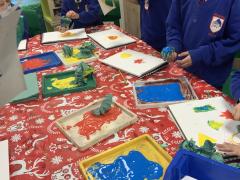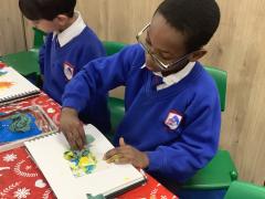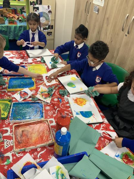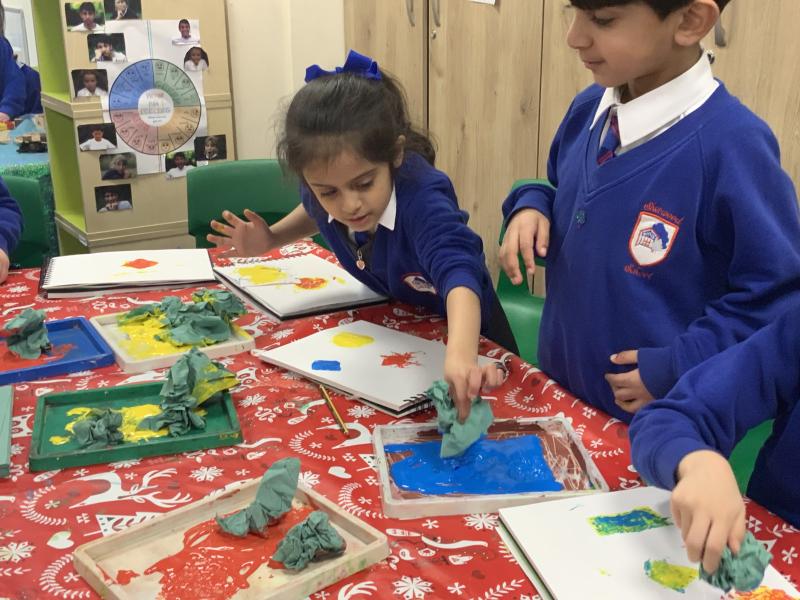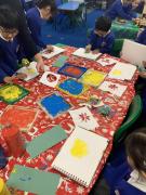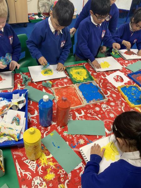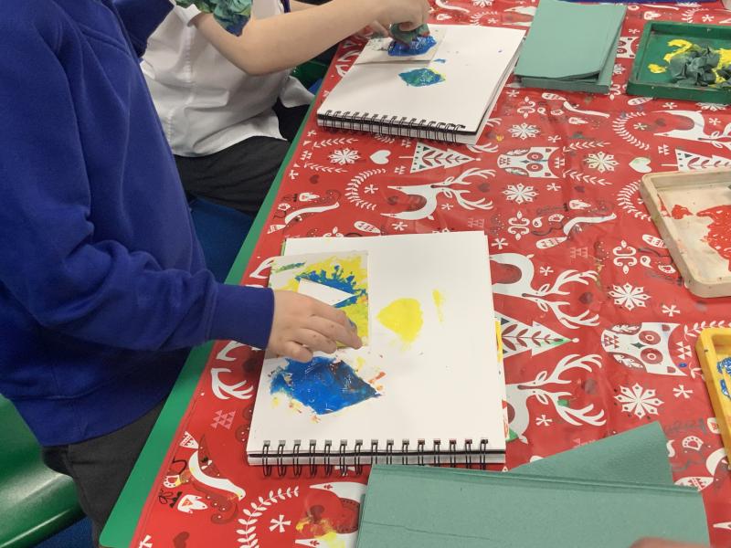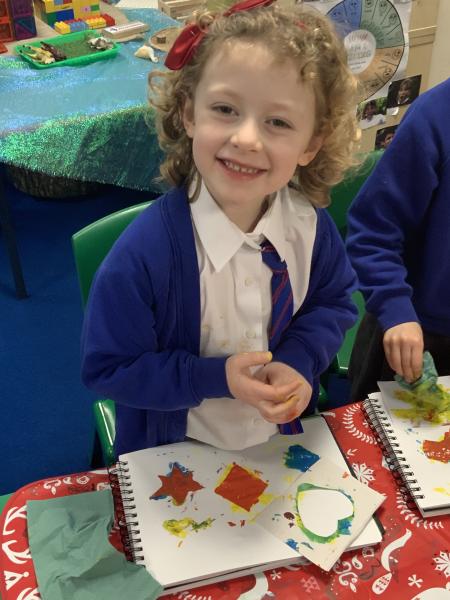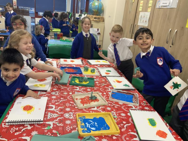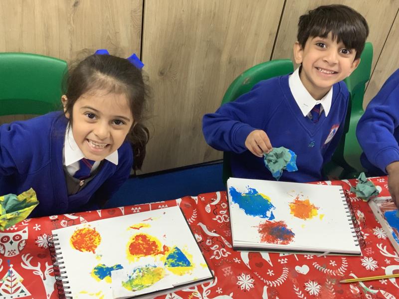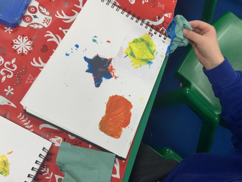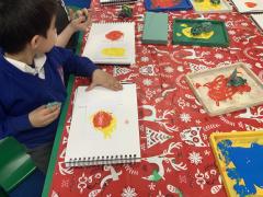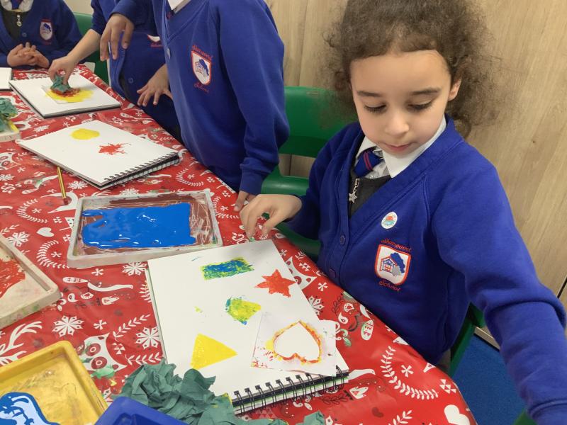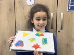In art this week, we have been exploring positive and negative stencils using paint to print patterns. The children noticed that when two primary colours are used on top of each other, a secondary colour is made.