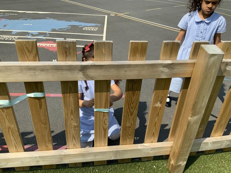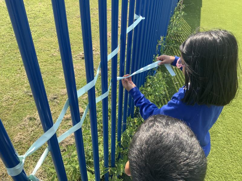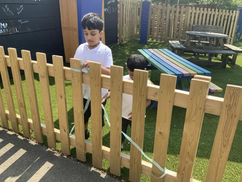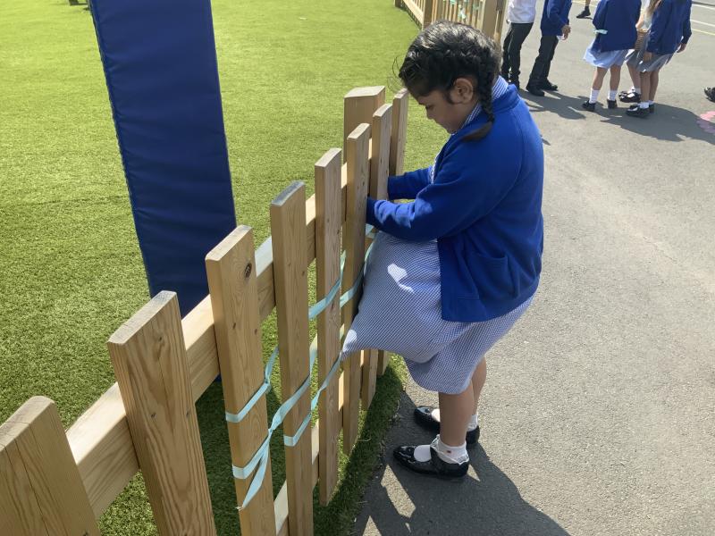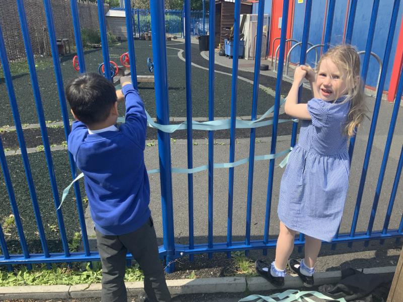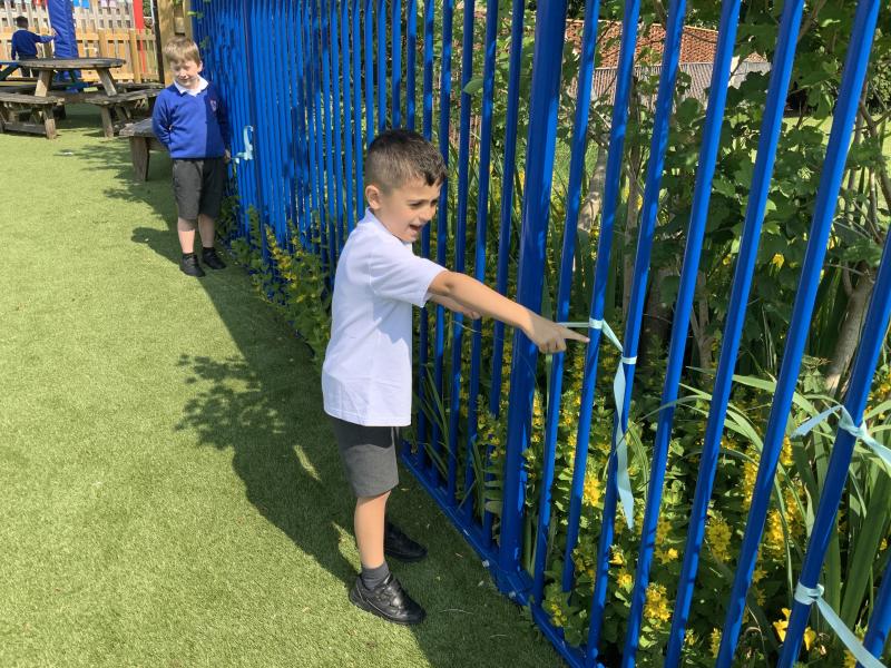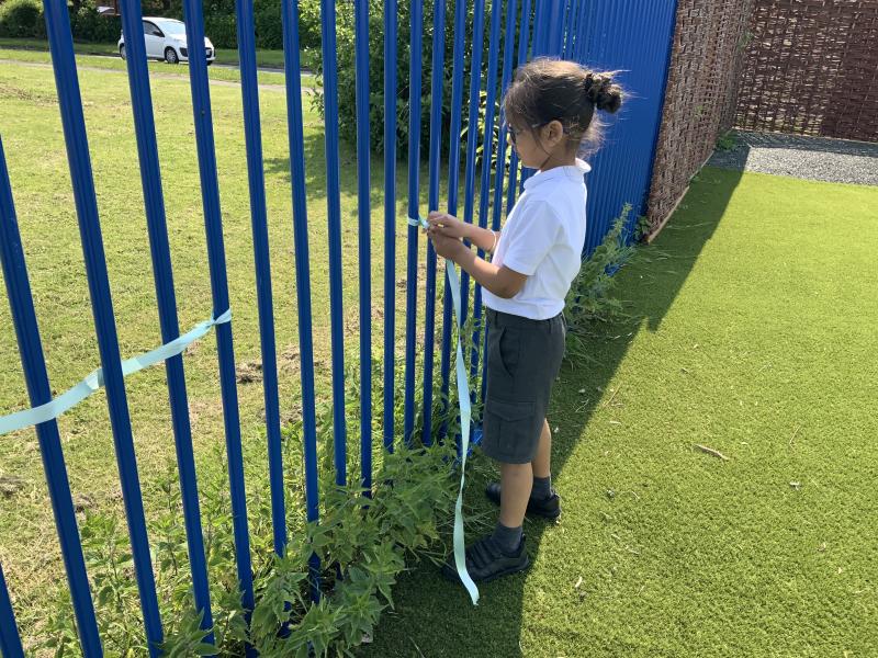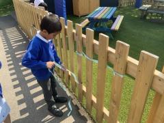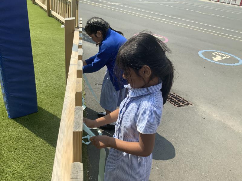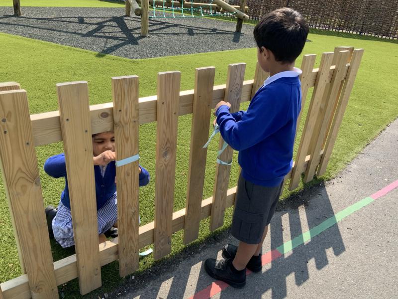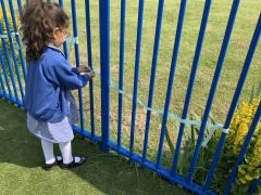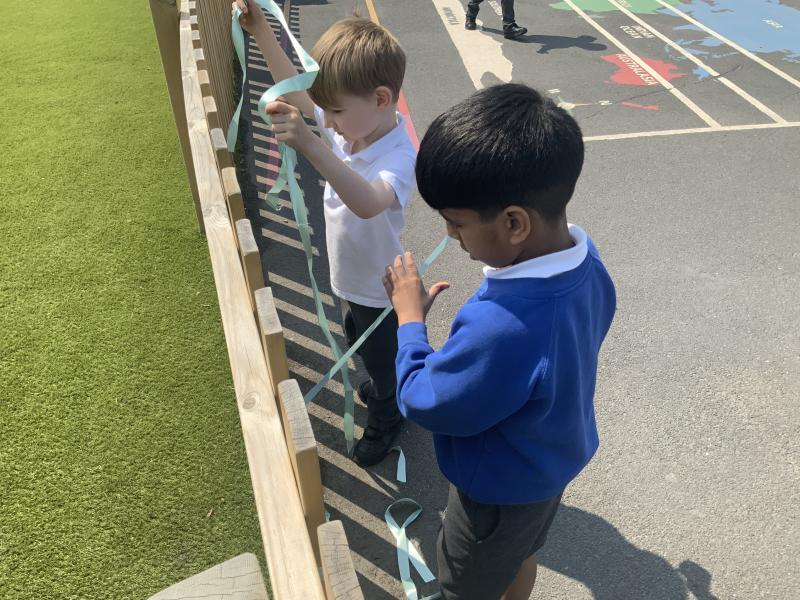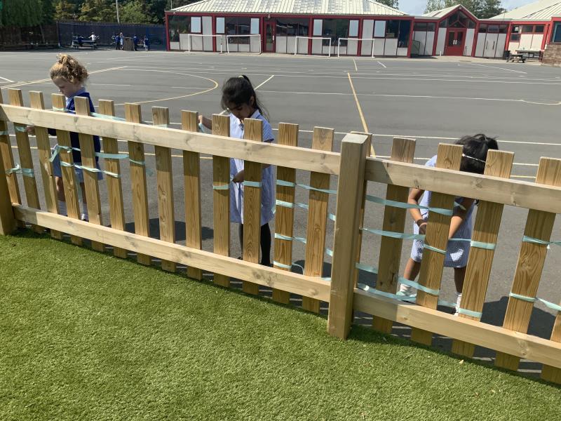 In art we have begun exploring textiles beginning with weaving. We took ribbons outside to find places to act as our loom whilst we practised weaving.