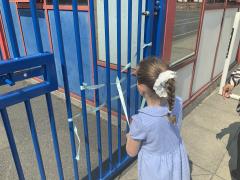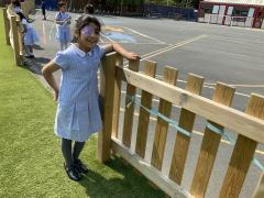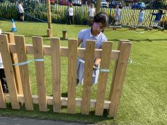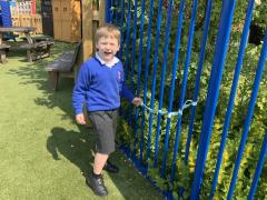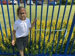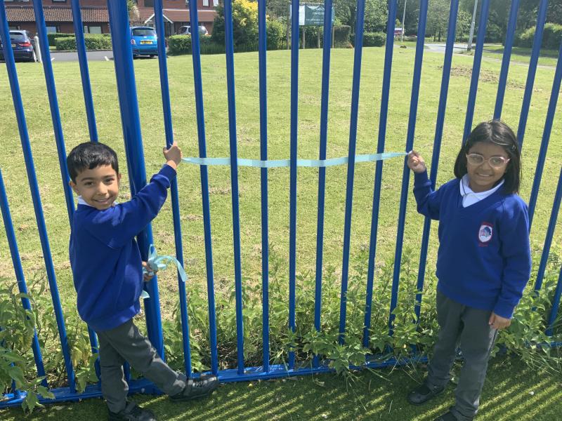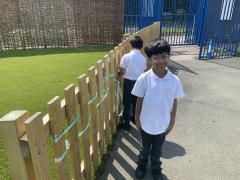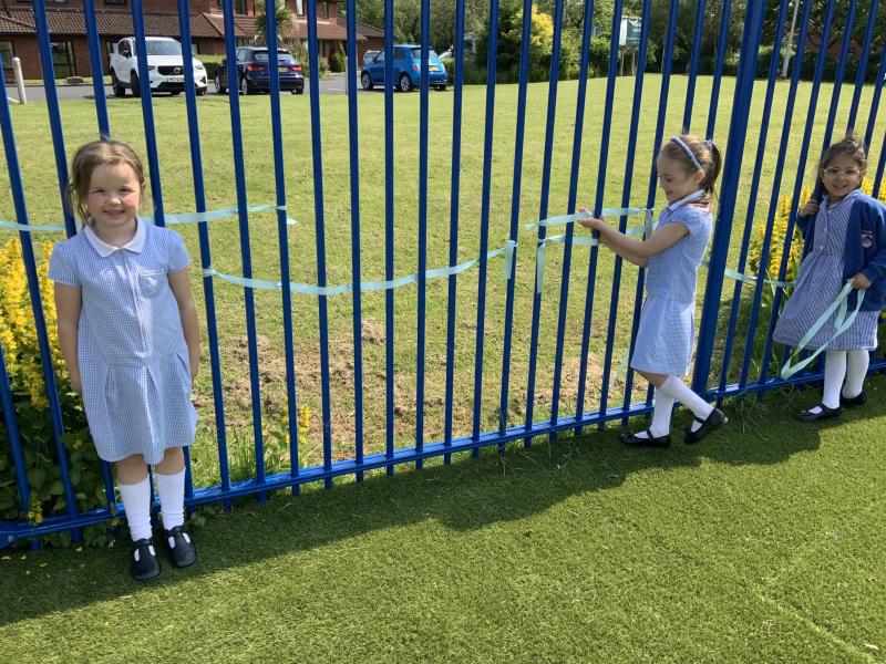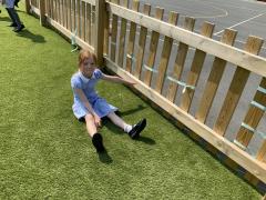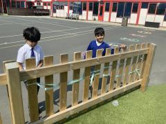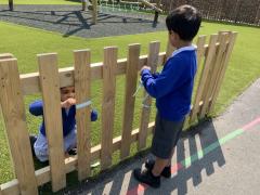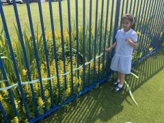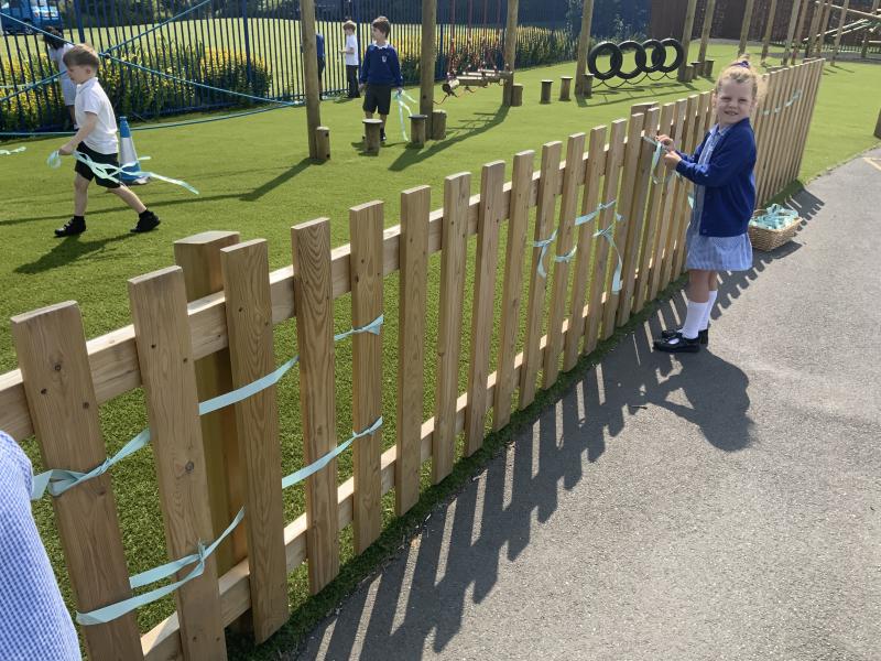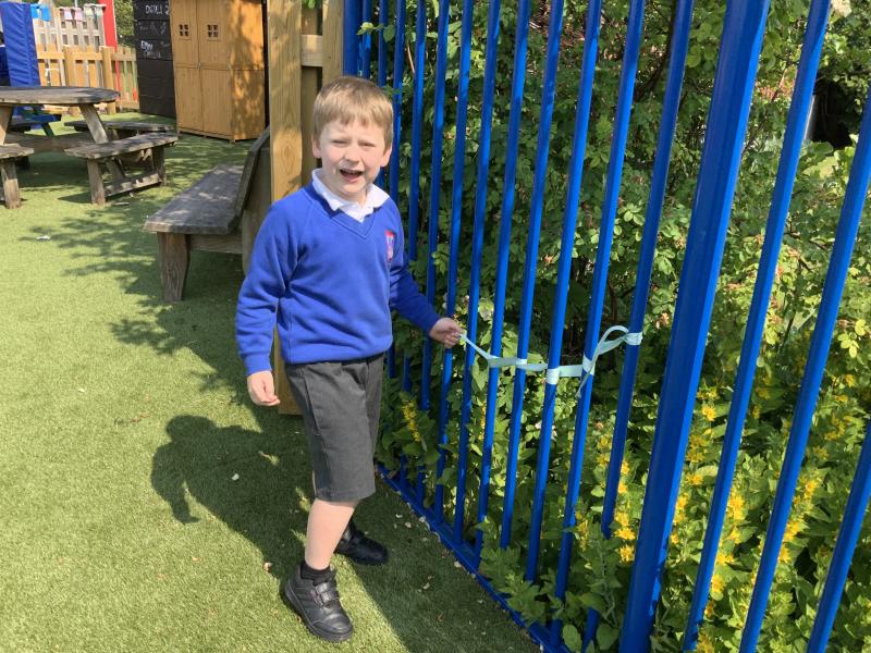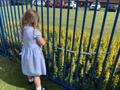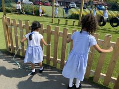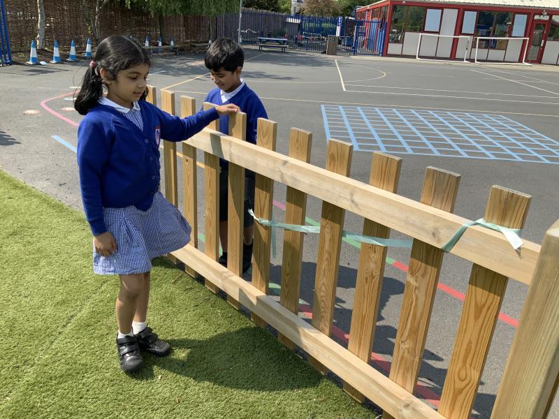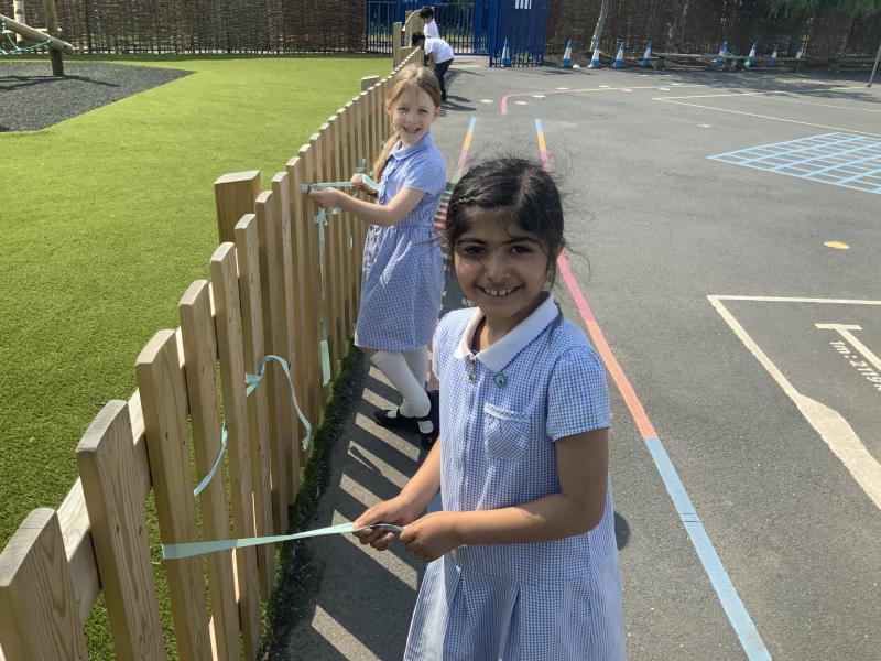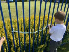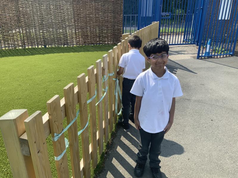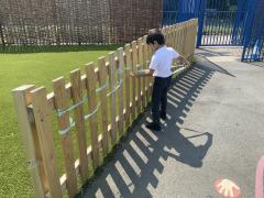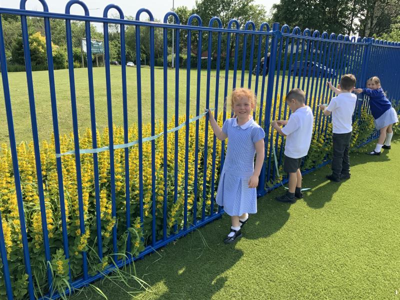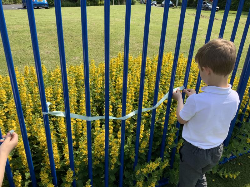 In art we have begun exploring textiles beginning with weaving. We took ribbons outside to find places to act as our loom whilst we practised weaving.