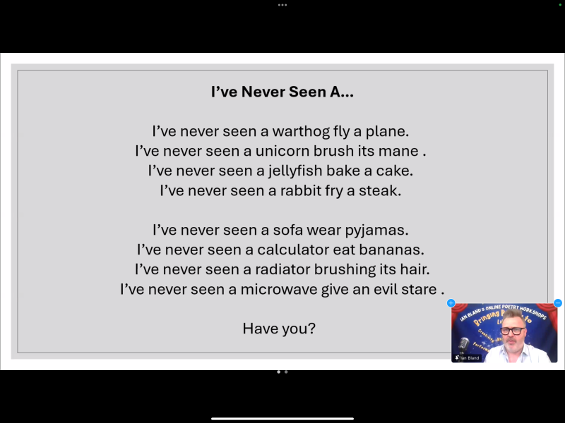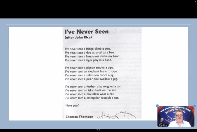 Today Year 3 took part in a poetry workshop with the poet Ian Bland. The children used rhyming pairs to create a poem with the title, 'I've Never Seen'.