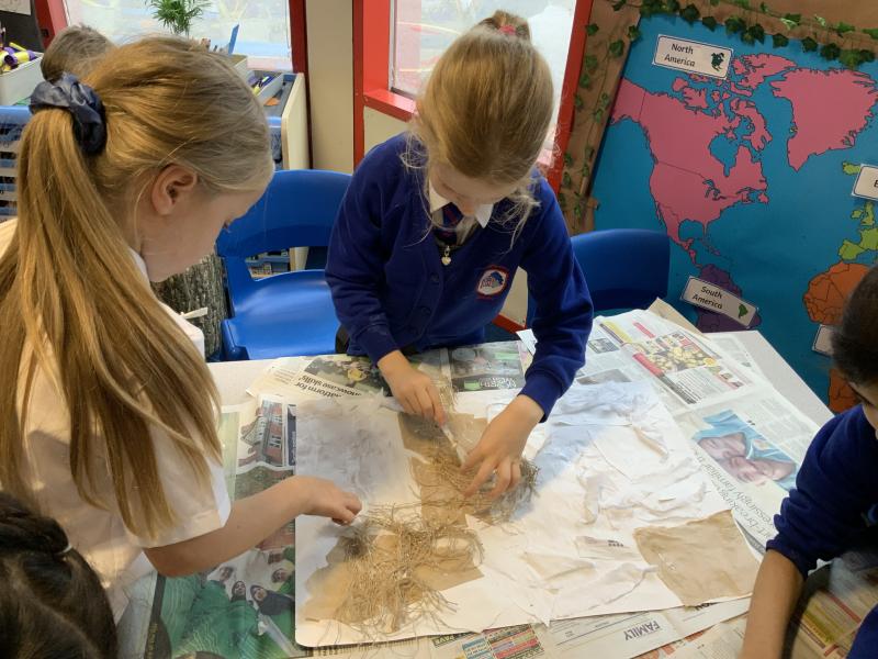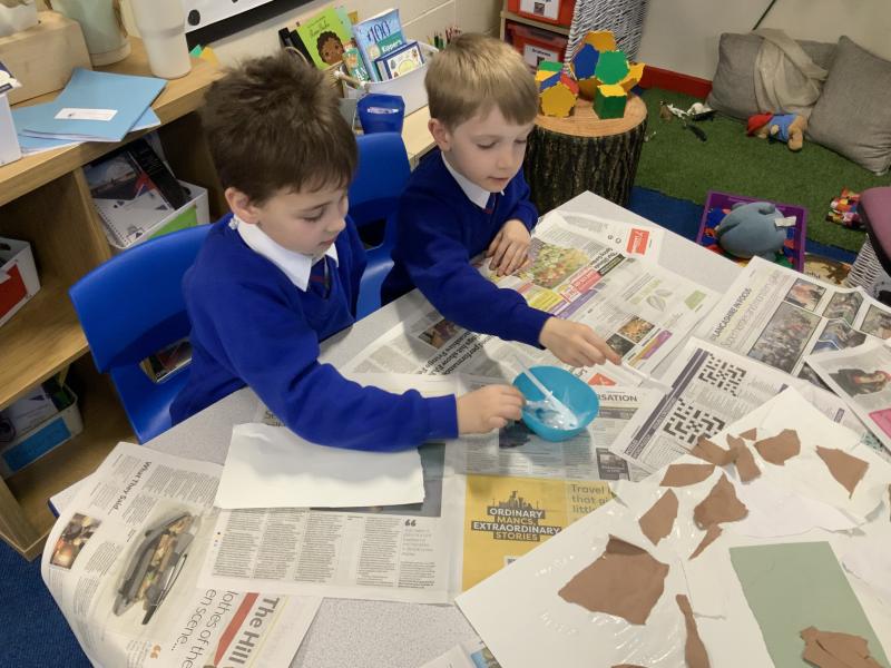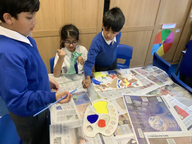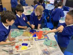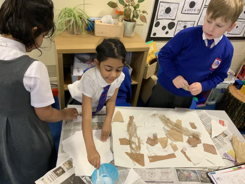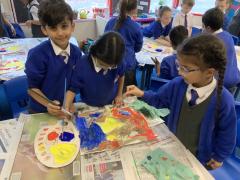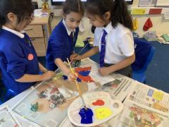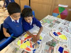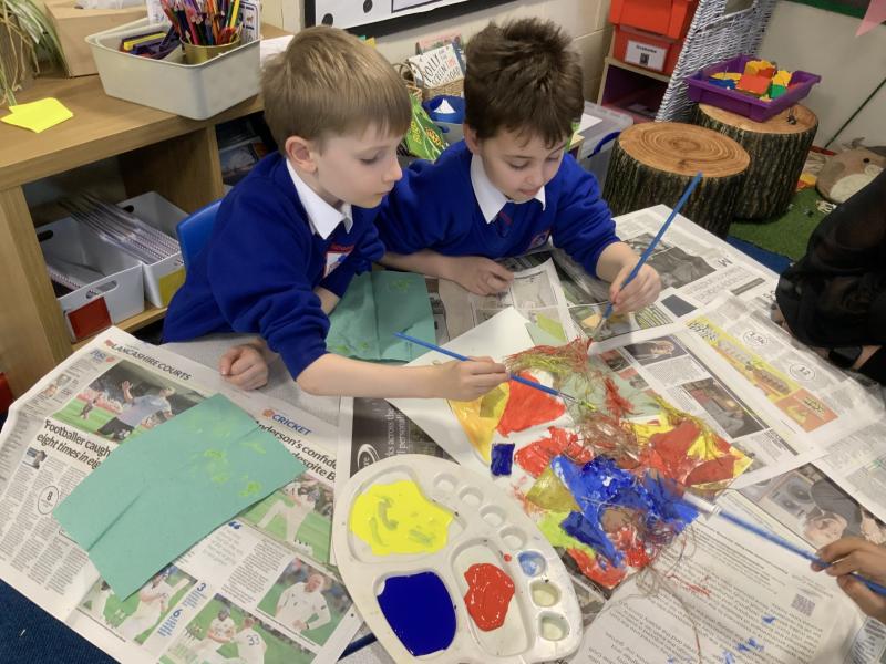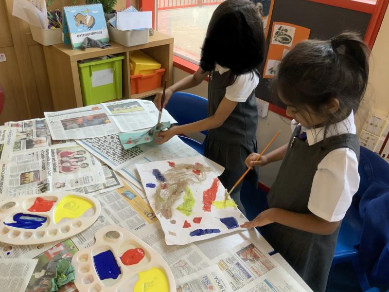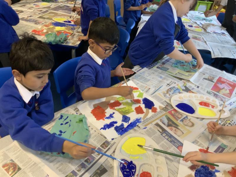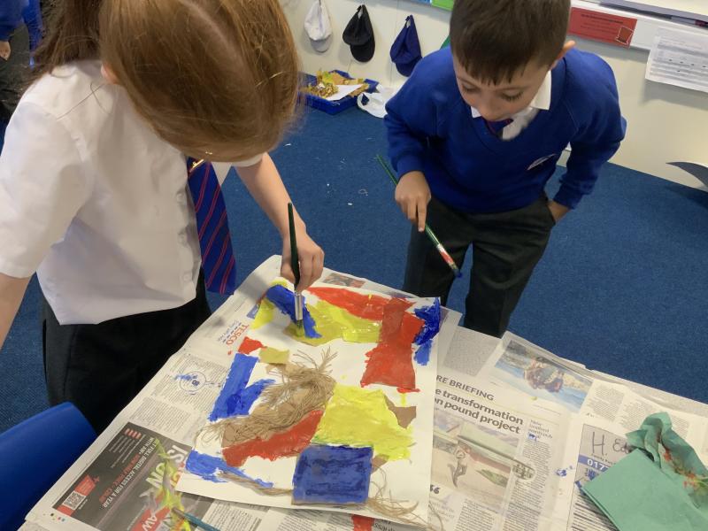 Year 2 enjoyed studying the Cornish artist, Anthony Frost, as part of their painting lesson using primary colours. They began by sticking layers of hessian, fabric and papers to create a textured surface. The following week, they painted onto the surface to create stunning pieces that are on display in the classroom.
