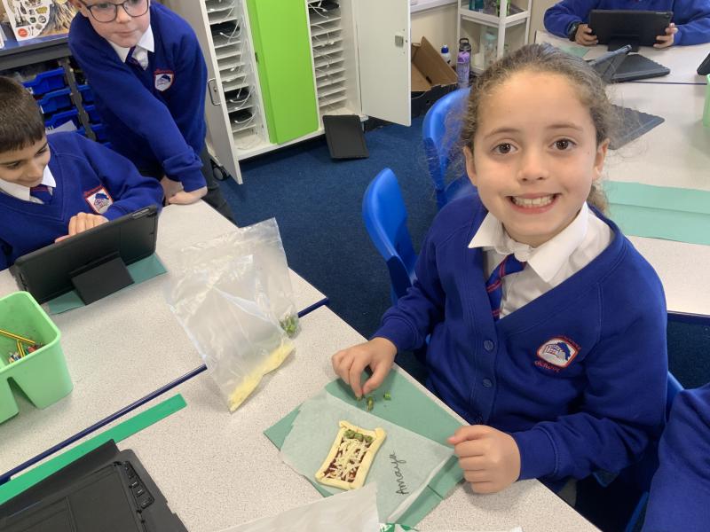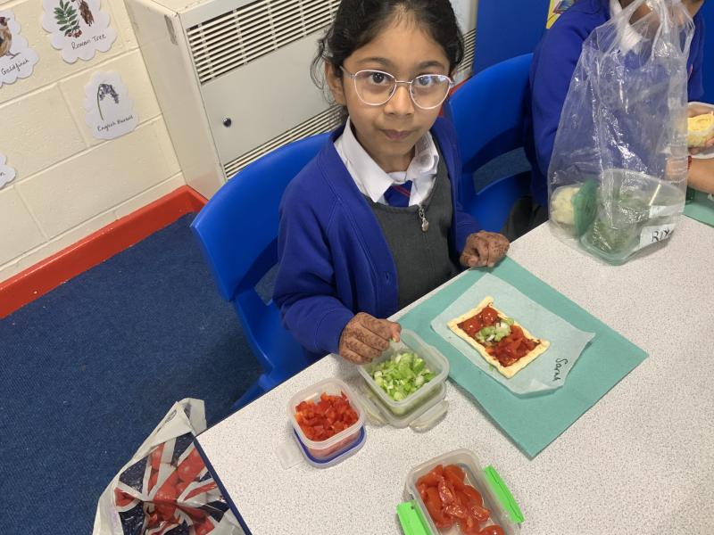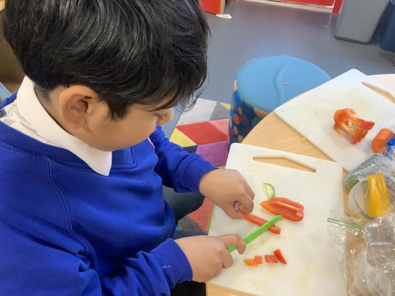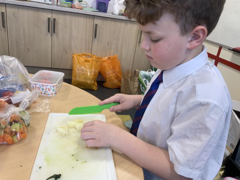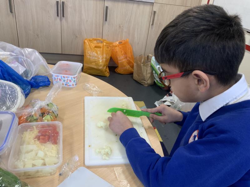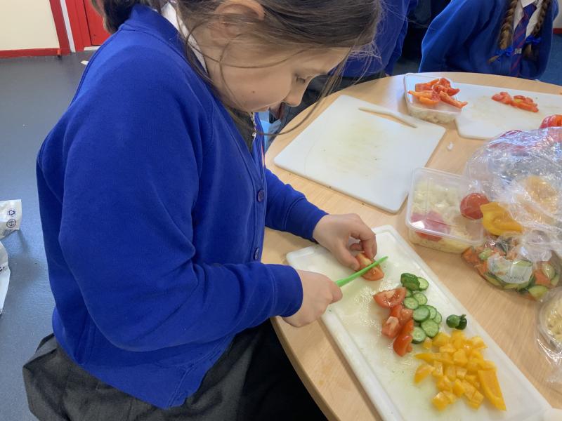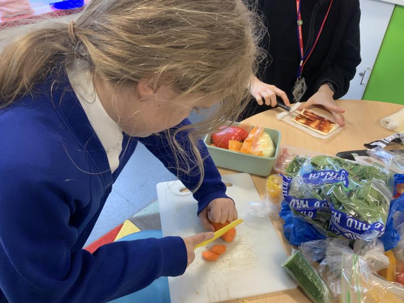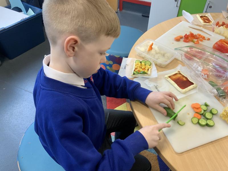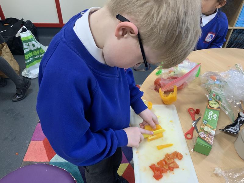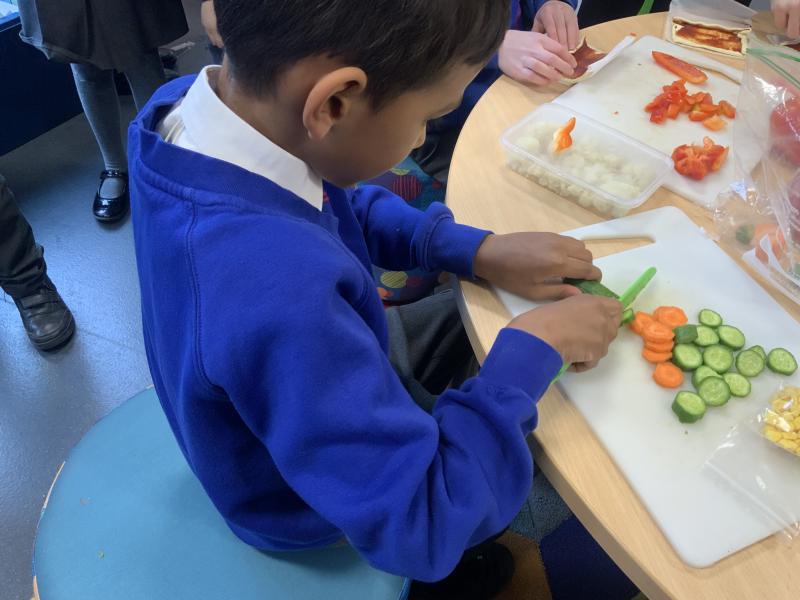 Over the past couple of weeks, the children have been learning about different foods and where they come from. They have been learning about different climates and where different foods come from. The children were given a challenge to help the school kitchen design a healthy, seasonal tart. The children designed their own tart with three seasonal vegetables and today they made their tarts. The children used the skill of chopping to make their ingredients smaller.
