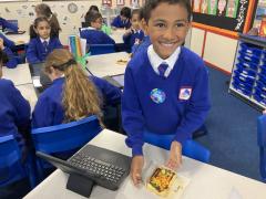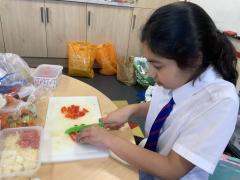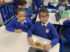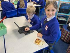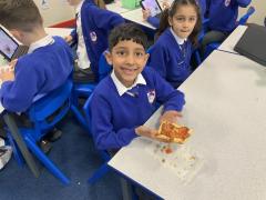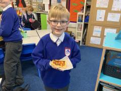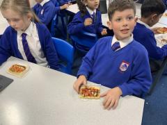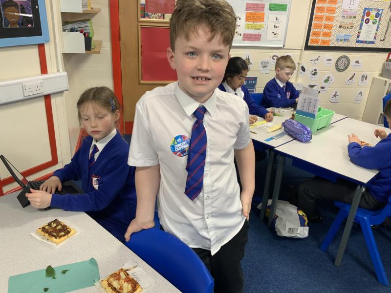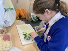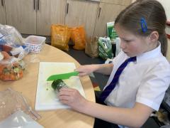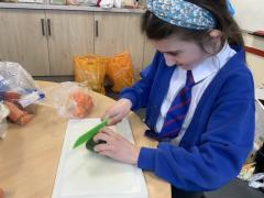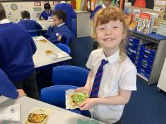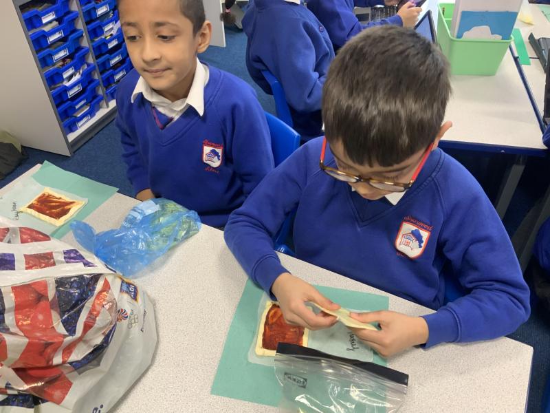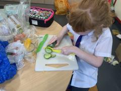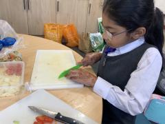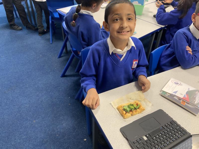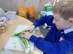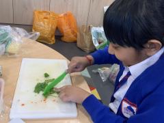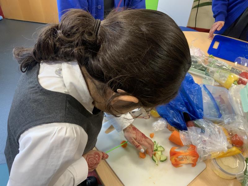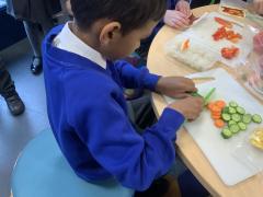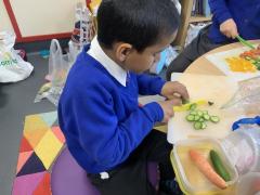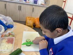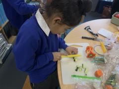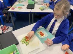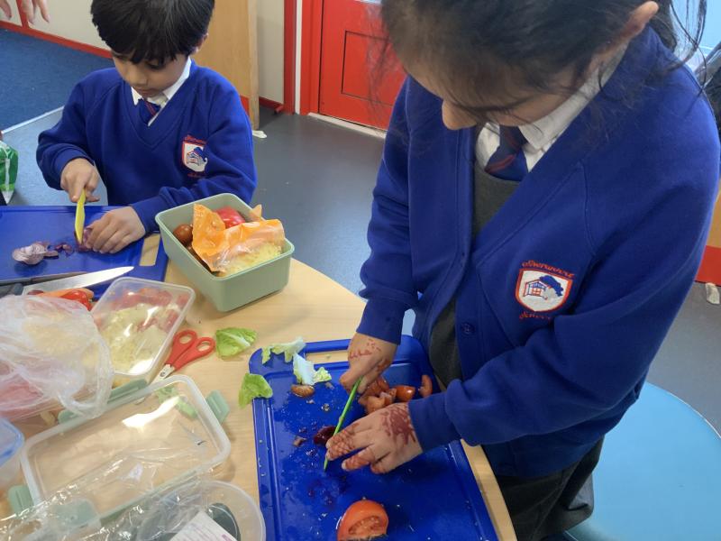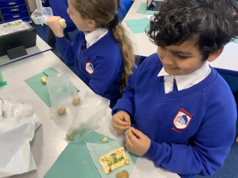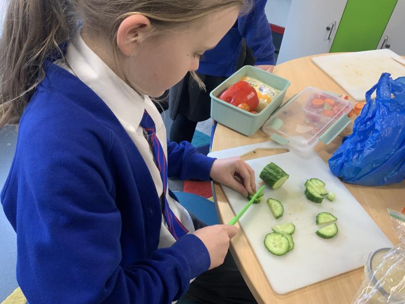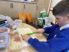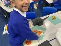 Over the past couple of weeks, the children have been learning about different foods and where they come from. They have been learning about different climates and where different foods come from. The children were given a challenge to help the school kitchen design a healthy, seasonal tart. The children designed their own tart with three seasonal vegetables and today they made their tarts. The children used the skill of chopping to make their ingredients smaller.