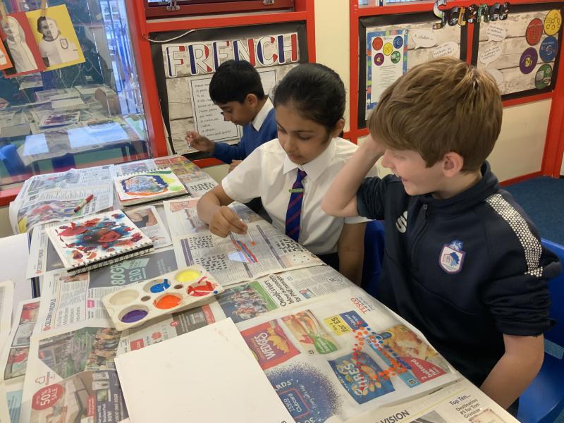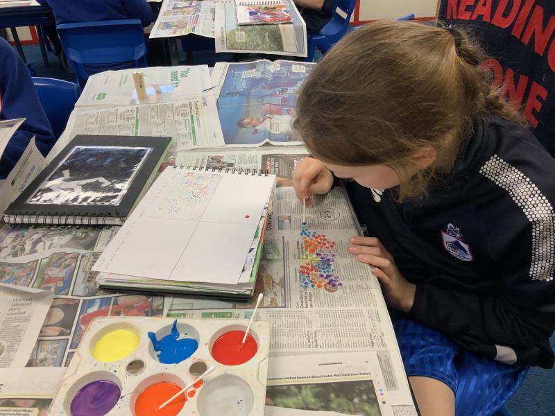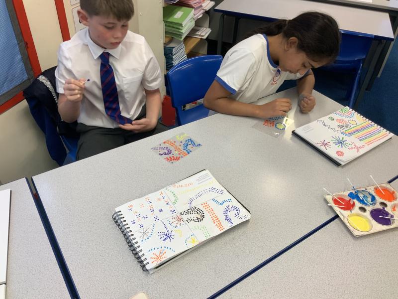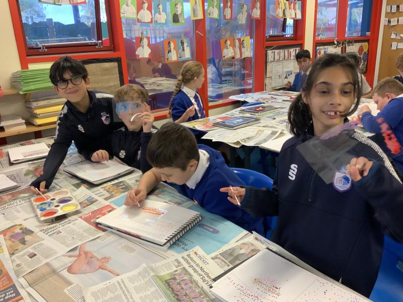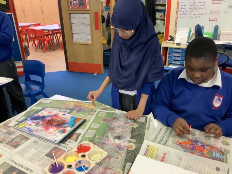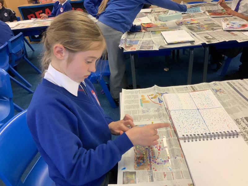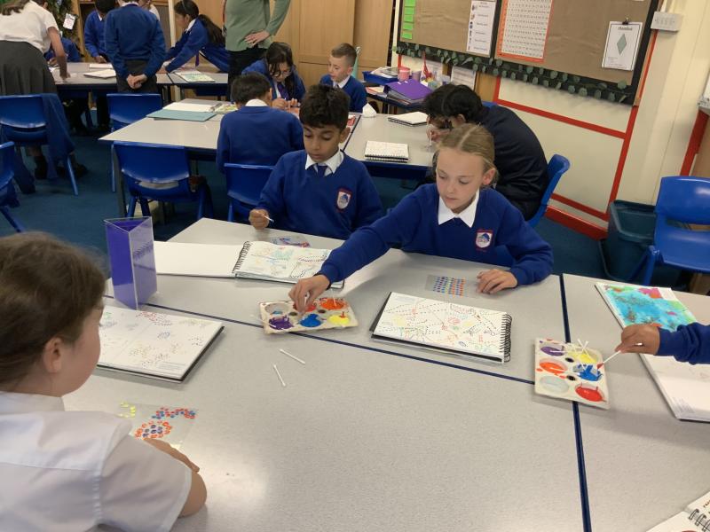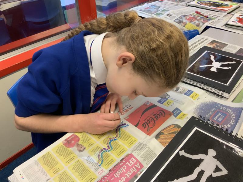This week we added our final layer to our Chris Ofili multi-layered painting. We chose our best dotted pattern from last week and painted it onto an overlay to layer onto the original painting and collage. The finished products look amazing!