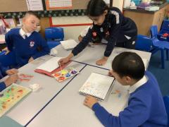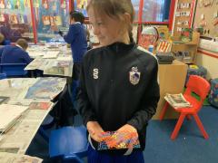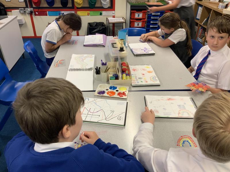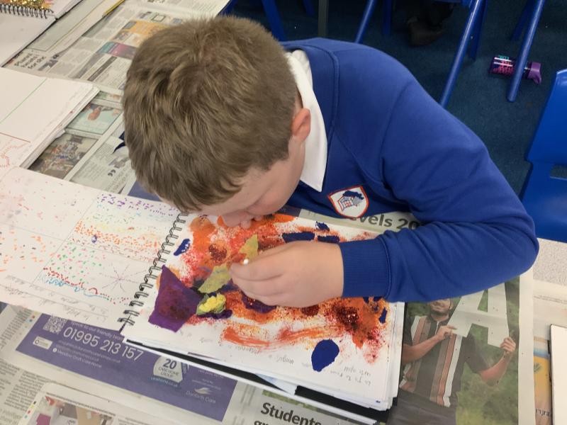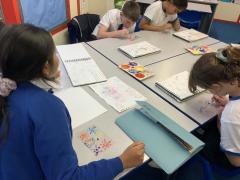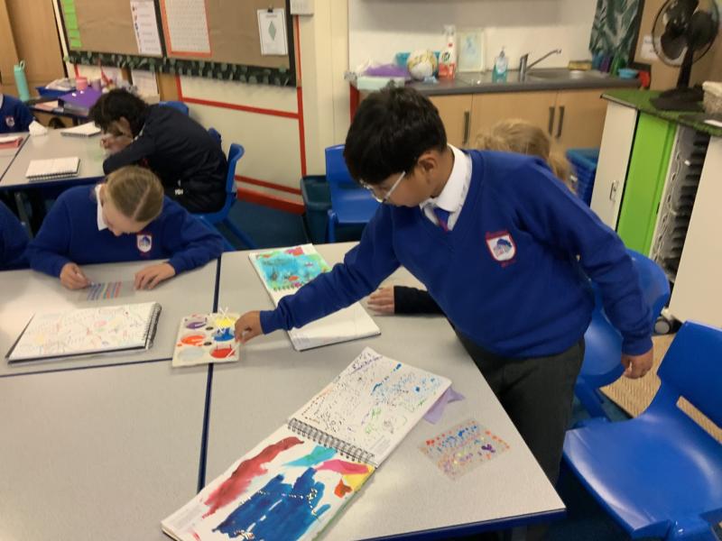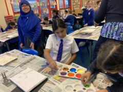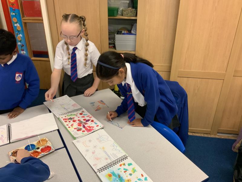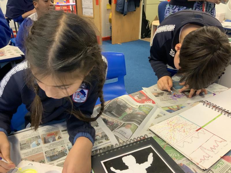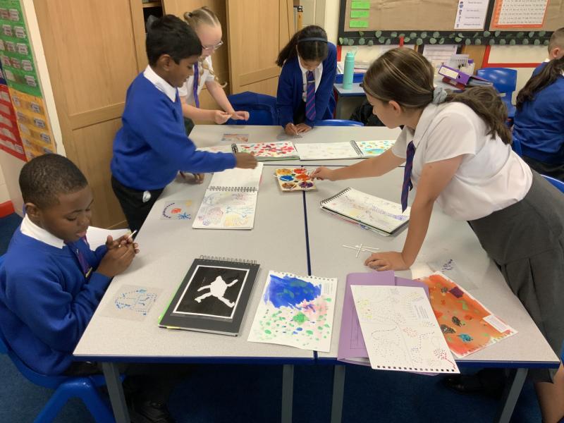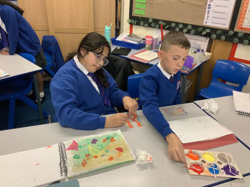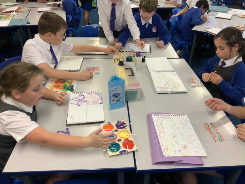 This week we added our final layer to our Chris Ofili multi-layered painting. We chose our best dotted pattern from last week and painted it onto an overlay to layer onto the original painting and collage. The finished products look amazing!